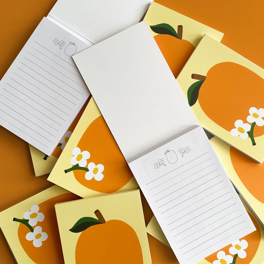 Värikäs hedelmä-aiheinen lehtiö, jonka sisäsivut on viivoitettu ja liimasidonnan ansiosta yksittäinen sivu on helppo ja siisti repäistä irti tarvittaessa.